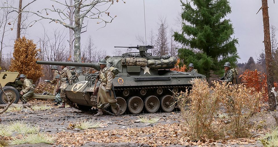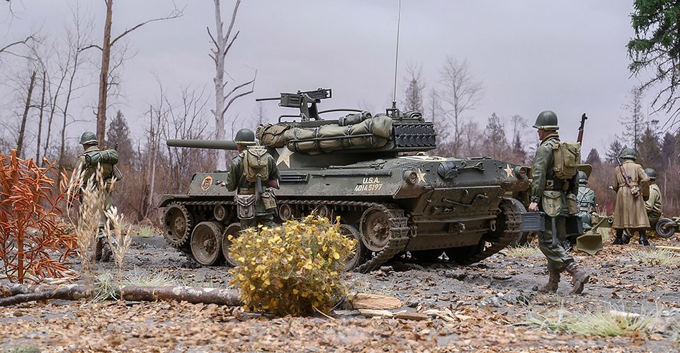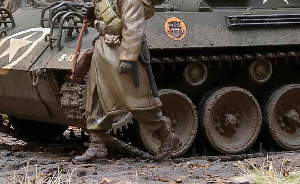 Here is a pretty good photo of the crew of our M10 with M1 Helmets on…as mentioned this seems pretty typical of crews of TDs in the later months in the ETO.I recently sculpted 2 new tankers wearing the M1 helmet over the fiber tankers helmet for the M4A3 (76) medium tanks (Shermans) that will be released in a few months. I enjoyed sculpting these and I agree that more crewman for the M18 and M10 wearing only the M1 helmet will be good additions… I just fished some halftrack crewman so these new tankers are moving up the list pretty fast.