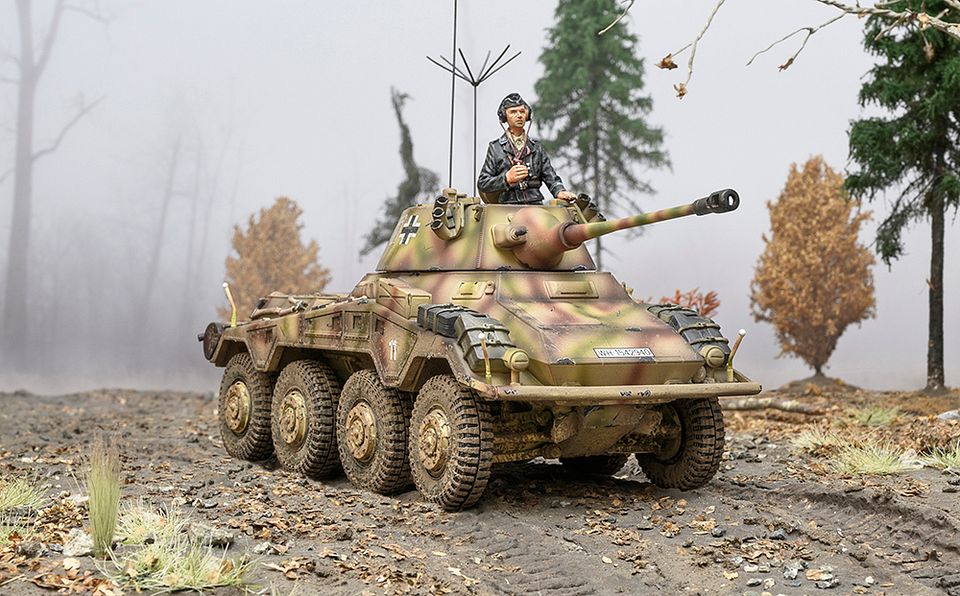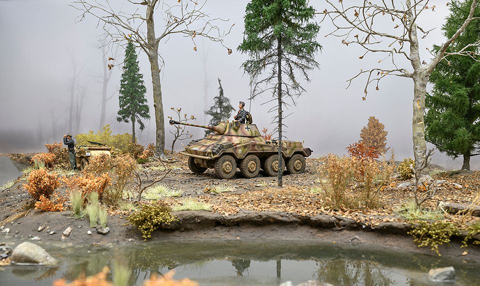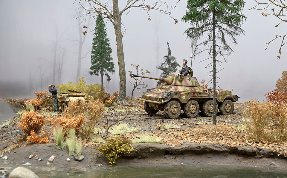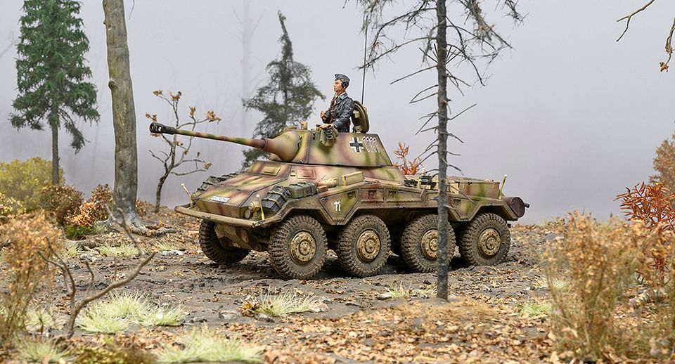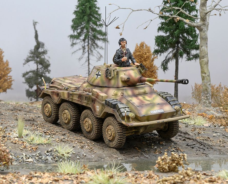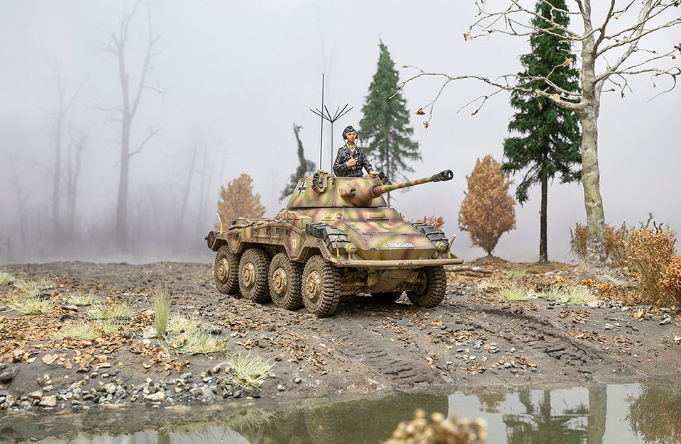 An Sd.Kfz.234/2 "Puma" from Kampfgruppe von Böhm, Panzer Aufklärungsabteilungen 2 (2. Panzer-Division) probes forward during the Battle of the Bulge.