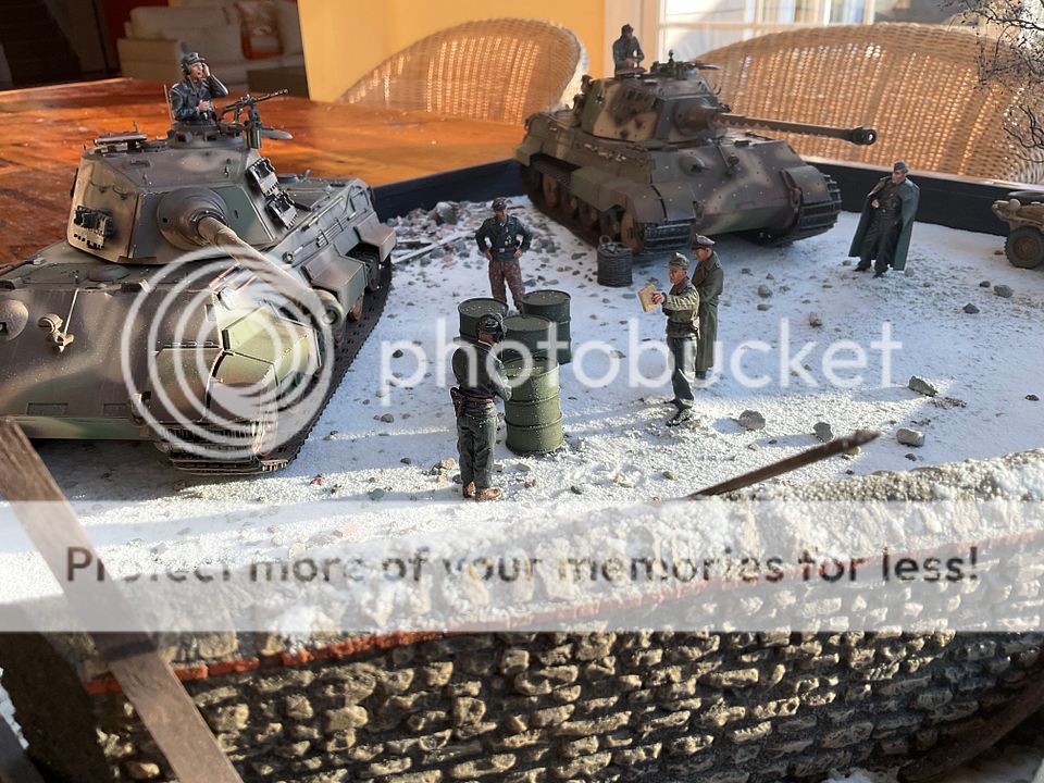 Having received the two Jenkins King Tigers and planning a trip to La Gleize, I decided to create a display. Still waiting for a house facade to finish the display off, the current wall is a stand in. The battle for the last barrels of fuel has begun in December 1944.