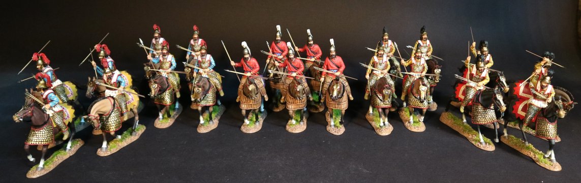Roman Auxilia cavalry were usually heavily armored in mail and armed with a short lance, javelins, the Spatha long sword, and sometimes bows for specialist Horse archer units. These men primarily served as Medium missile cavalry for flanking, scouting, skirmish, and pursuit.